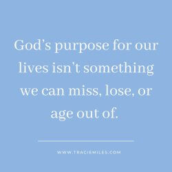 What is God calling you to do that you have been putting on the back burner for what seems like valid reasons? Whatever it is, remember this: God’s purpose for our lives isn’t something we can miss, lose or age out of. Â He is a patient heavenly Father, and when we’re ready, He will welcome us into our purpose with open arms and lead us every step of the way.